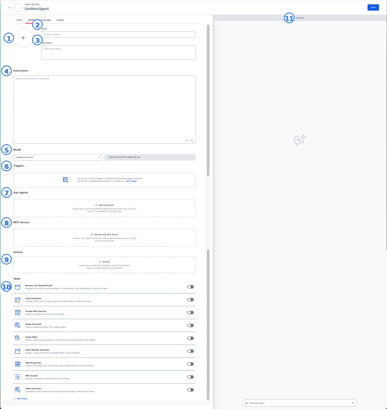 - 11. Preview: A quick way to test out the Agent that you're building with the settings applied so far.