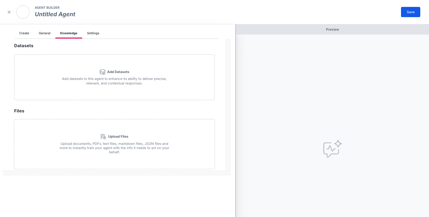 Tab: Knowledge - This is where relevant Datasets and/or Views and Files can be assigned to the Agent that it will need in order to complete its task/goal.