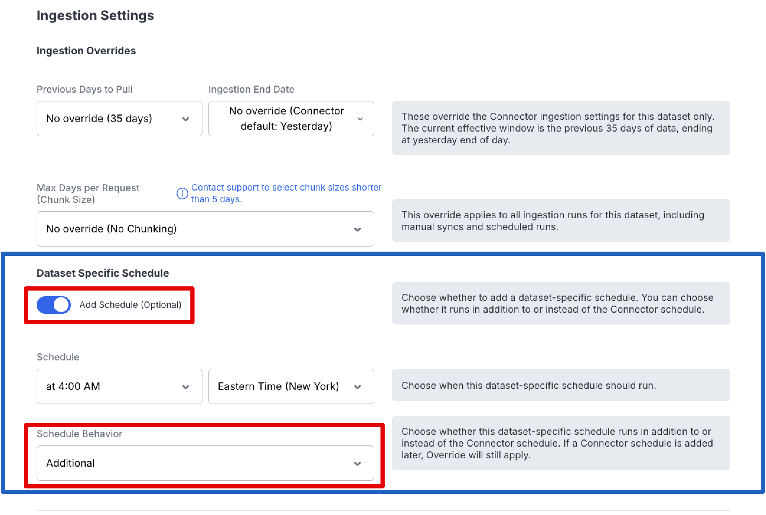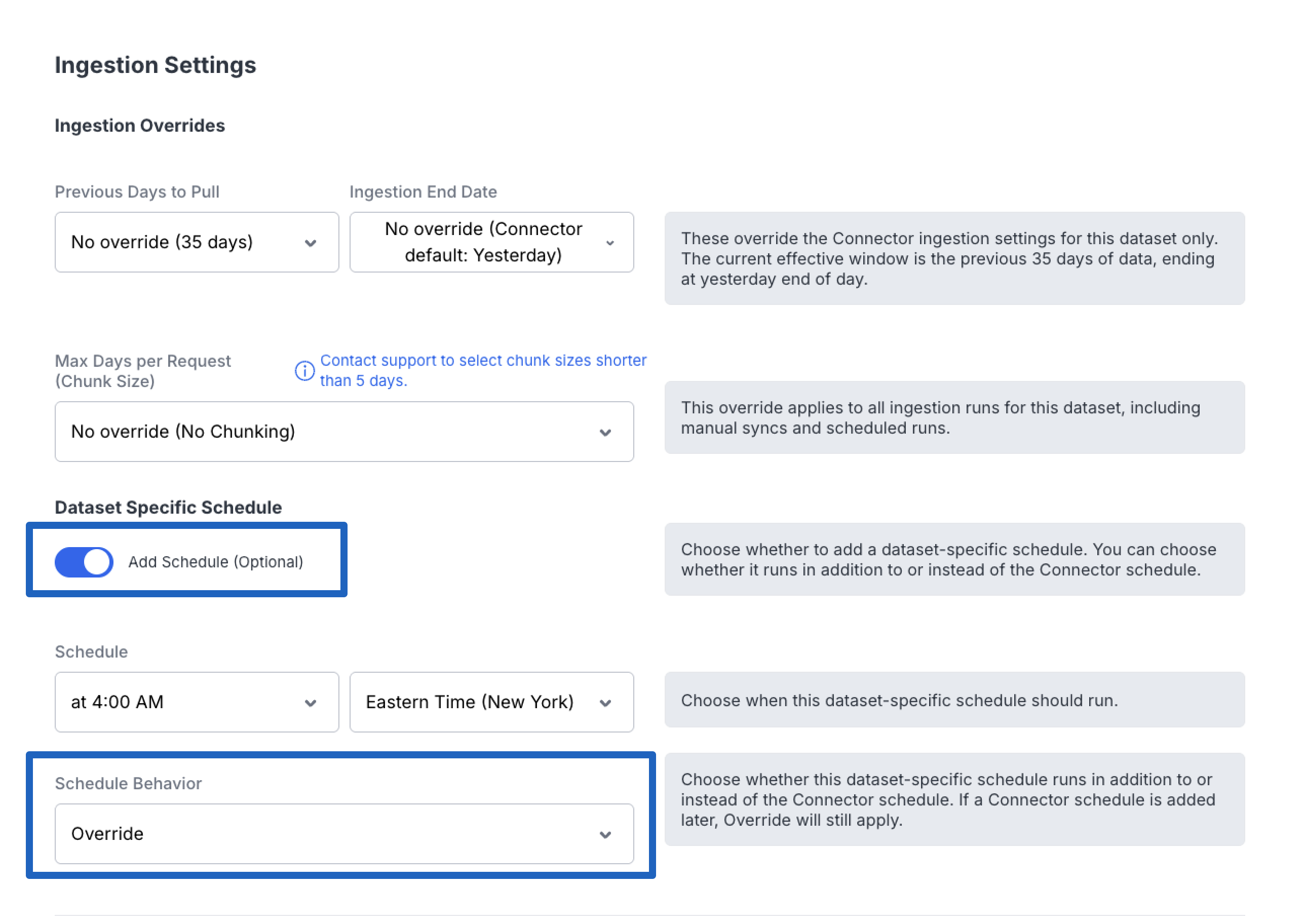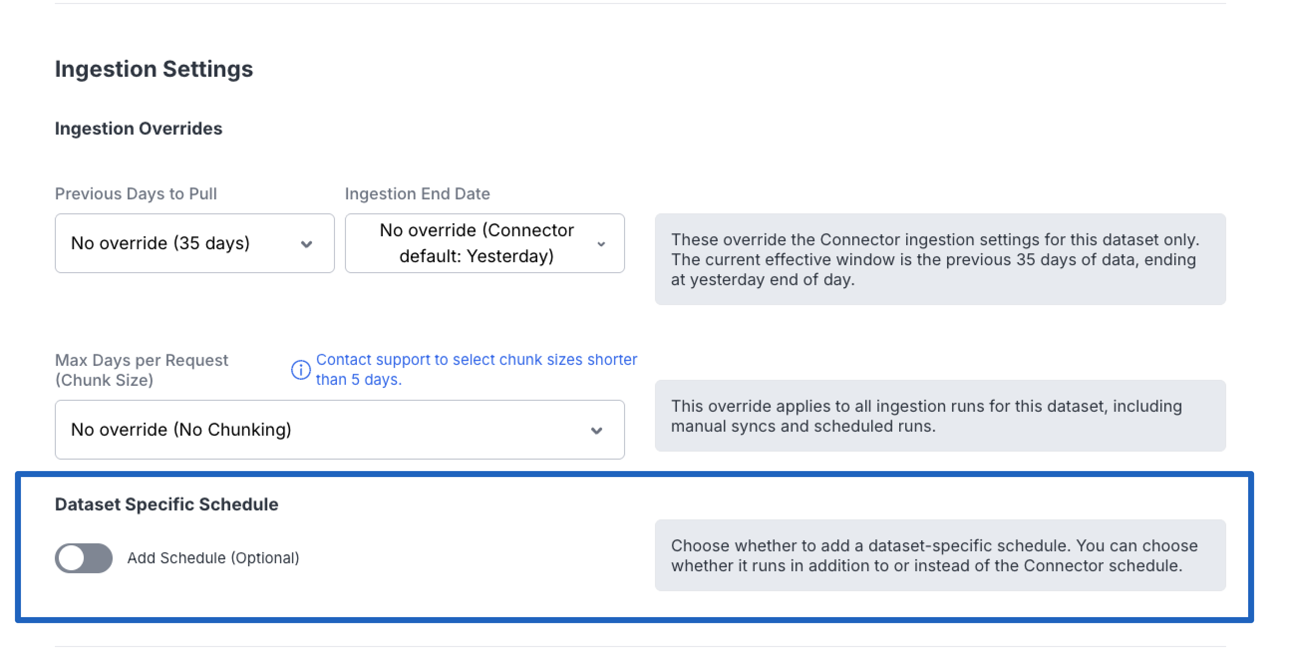 When adding a schedule, you can also choose to override the connector schedule entirely. This replaces the connector-level schedule for that specific dataset, giving you full independent control over when it syncs.