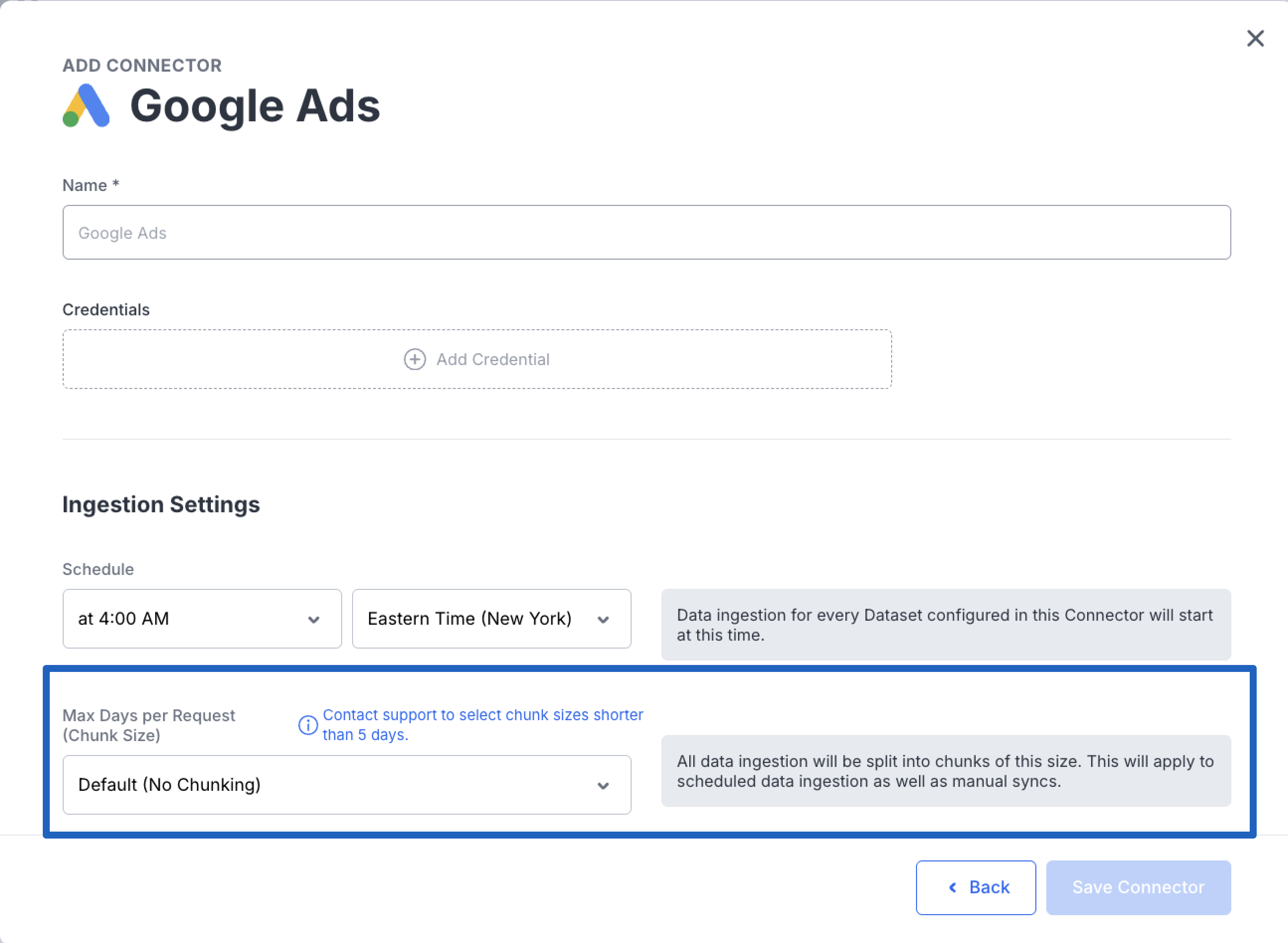 GuardrailsA minimum chunk size of 5 days is enforced to prevent configurations that could cause data sync issues. If your use case requires a chunk size smaller than 5 days, please contact NinjaCat Support.