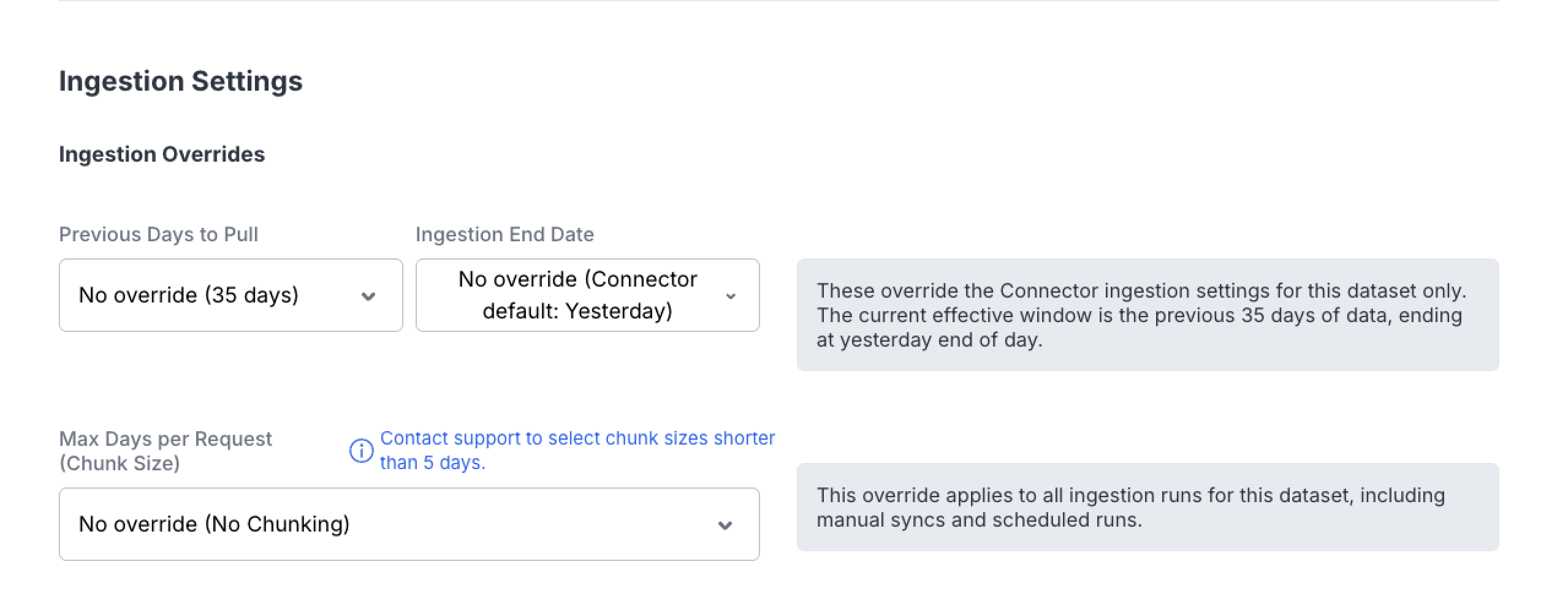 If a specific dataset needs different ingestion settings than its parent connector, you can override both the refresh lookback window and the chunk size independently at the dataset level.