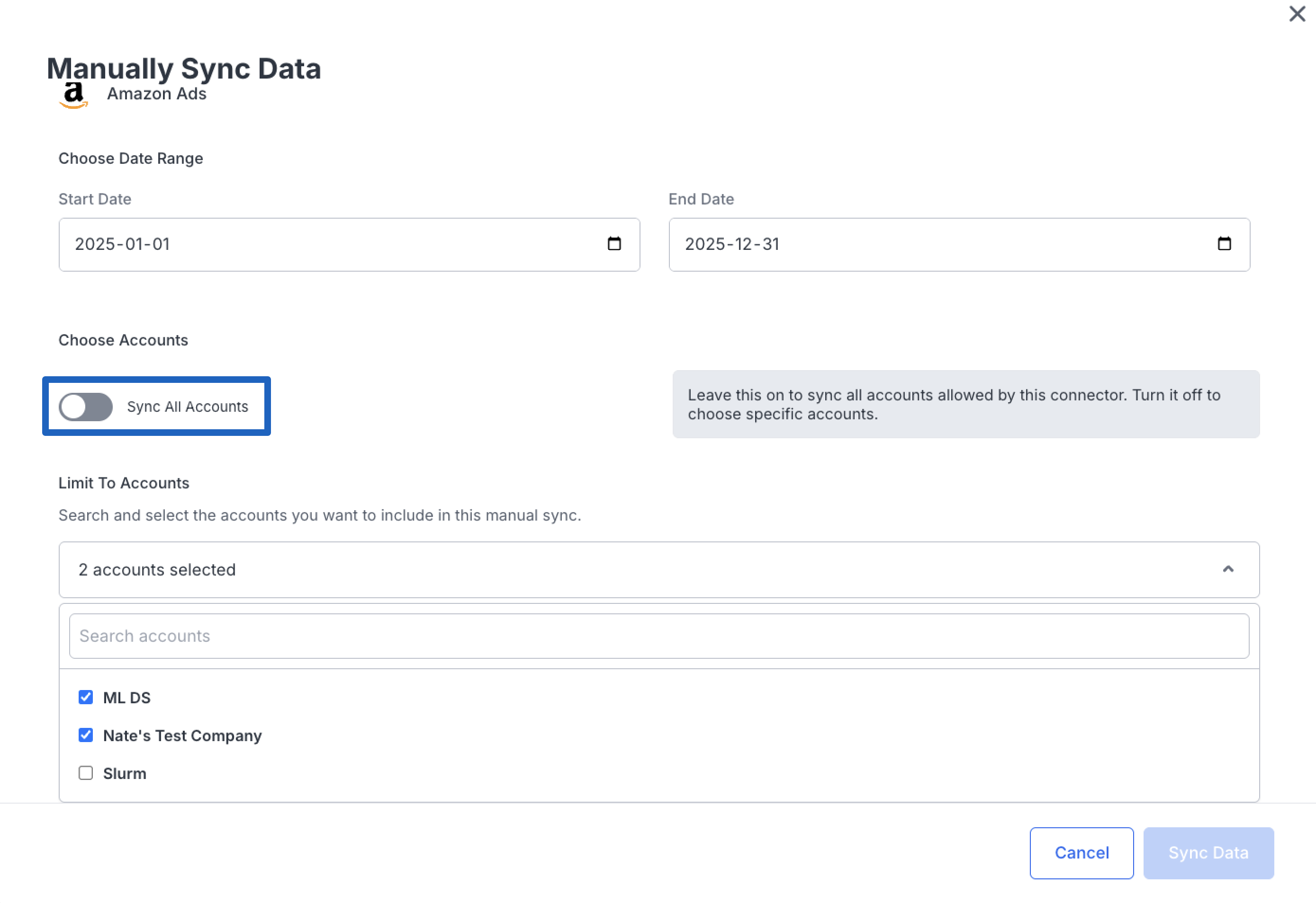 In addition to the existing manual sync functionality, you can now kick off a backfill for a specific date range targeting one or multiple accounts. This gives you more surgical control when you need to re-pull data for a particular period.
