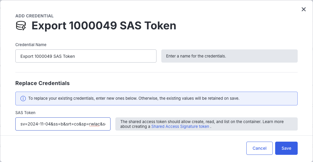 Copy the generated "SAS token" value and create a new credential in the Export -> Credentials screen. For Example: