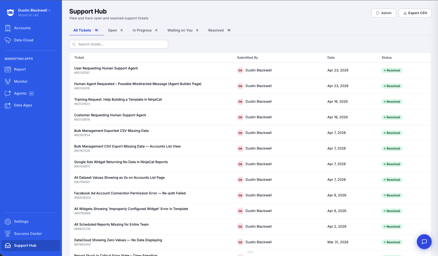 The Support Hub by default shows just tickets that you have submitted. However if your NinjaCat Account has the "System Admin" role assigned to it you also have the ability to see all tickets submitted by your team via the Admin Button. This makes it easy for tSystem Admins to monitor the status of open issues across your organization.