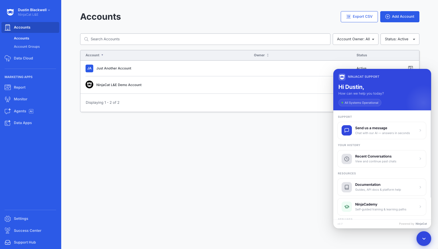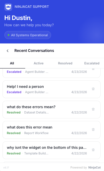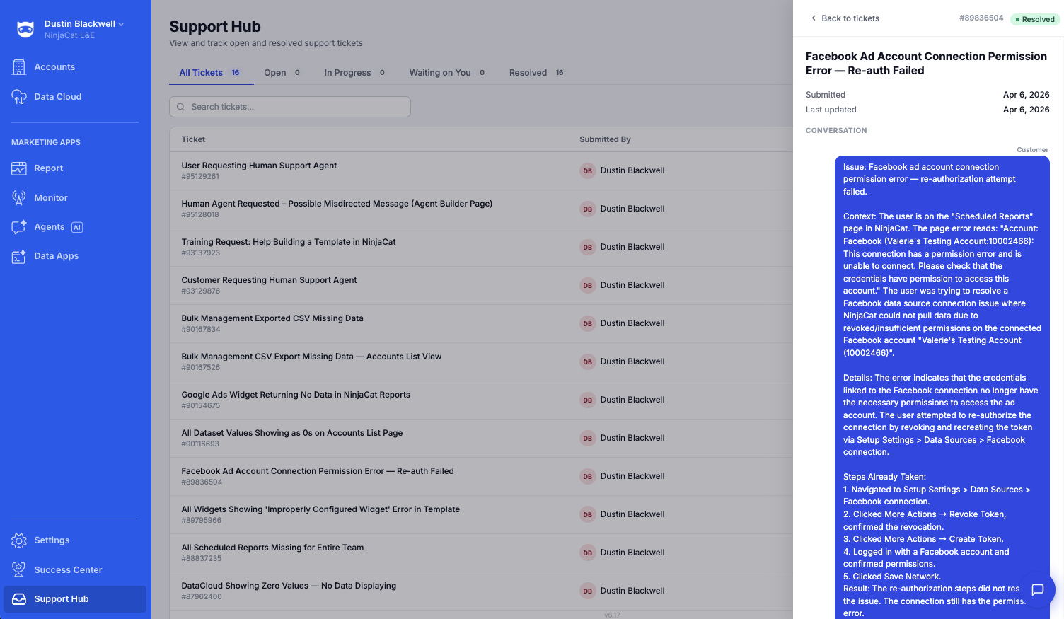 NinjaCat now includes a new version of Nina: an AI assistant powered by NinjaCat's Agents, and the Support Hub: a ticket portal — both designed to get you answers and resolutions faster, without leaving the app. Whether you have a quick question or need hands-on support, Nina and the Support Hub work together to keep things moving.